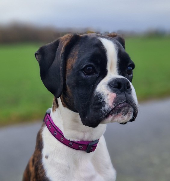 Ellie wurde in der offenen Klasse der weißen Boxer ausgestellt und erreichte auch das V1 und